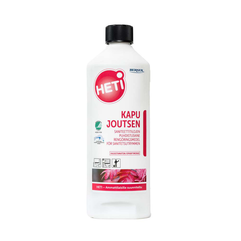 HETI Kapu Joutsen sopii käytettäväksi kalkkisaostumien ja ruosteen puhdistukseen kaakeli-, saniteettiposliini- ja teräspinnoilta. HETI Kapu Joutsen ei kuitenkaan sovi happoaroille pinnoille kuten esim. marmorille. HETI Kapu Joutsen on vahvasti hapan puhdistusaine, joka vaatii neutraloinnin ja huuhtelun. Tuotteella voidaan suorittaa myös saniteettitilojen jaksottainen puhdistus. HETI Kapu Joutsenella on Joutsenmerkin lisäksi myös Allergia-, iho- ja astmaliiton Allergiatunnus.