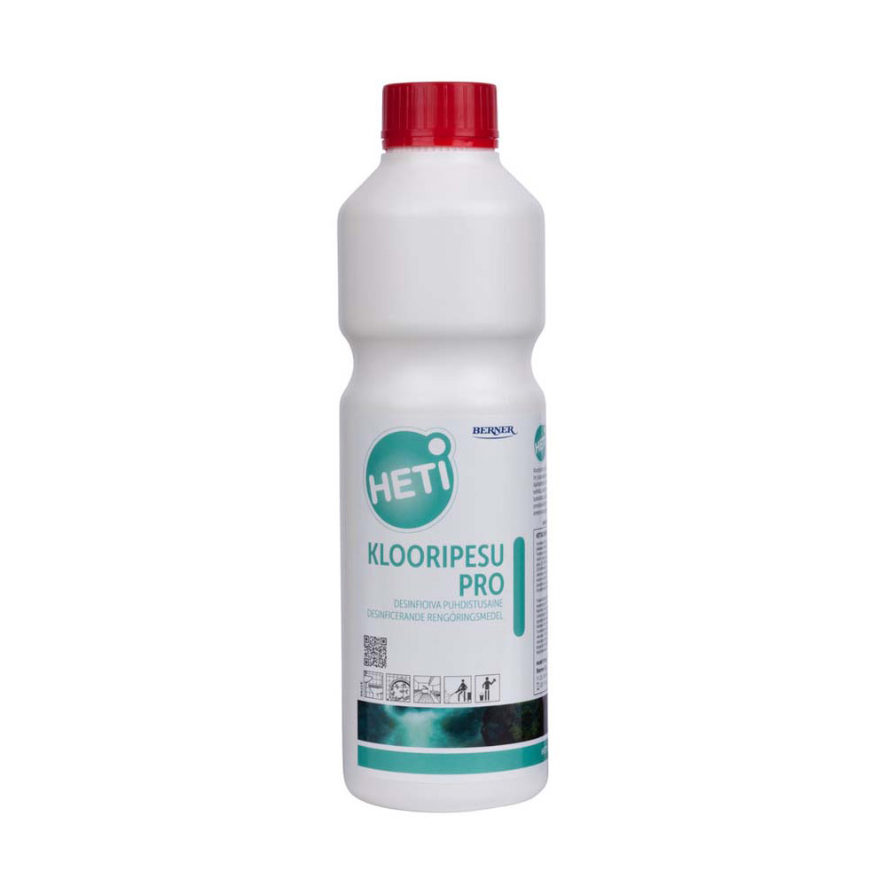 Monikäyttöinen desinfioiva HETI Klooripesu Pro puhdistusaine soveltuu tiloihin, joissa on korkeat hygieniavaatimukset. Käyttökohteita mm: saniteetti- ja sosiaalitilat sekä kylmät saunatilat, keittiöiden pinnat/tasot ja laitteet, elintarviketilat, myymälät, uimahallit,kylpylät, lattiakaivot, liikuntasalit ja eläinten tuotantotilat. Tuote on natriumhypokloriittipohjainen. Desinfioiva puhdistusteho on testattu EN13727, EN13697, EN16615, EN13624, EN14476, EN14348 ja EN13704.