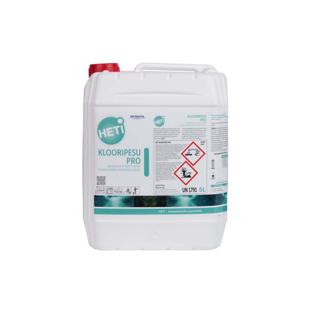 Monikäyttöinen desinfioiva HETI Klooripesu Pro puhdistusaine soveltuu tiloihin, joissa on korkeat hygieniavaatimukset. Käyttökohteita mm: saniteetti- ja sosiaalitilat sekä kylmät saunatilat, keittiöiden pinnat/tasot ja laitteet, elintarviketilat, myymälät, uimahallit, kylpylät, lattiakaivot, liikuntasalit ja eläinten tuotantotilat. Tuote on natriumhypokloriittipohjainen. Desinfioiva puhdistusteho on testattu EN13727, EN 13697, EN16615, EN13624, EN14476, EN14348 ja EN13704.