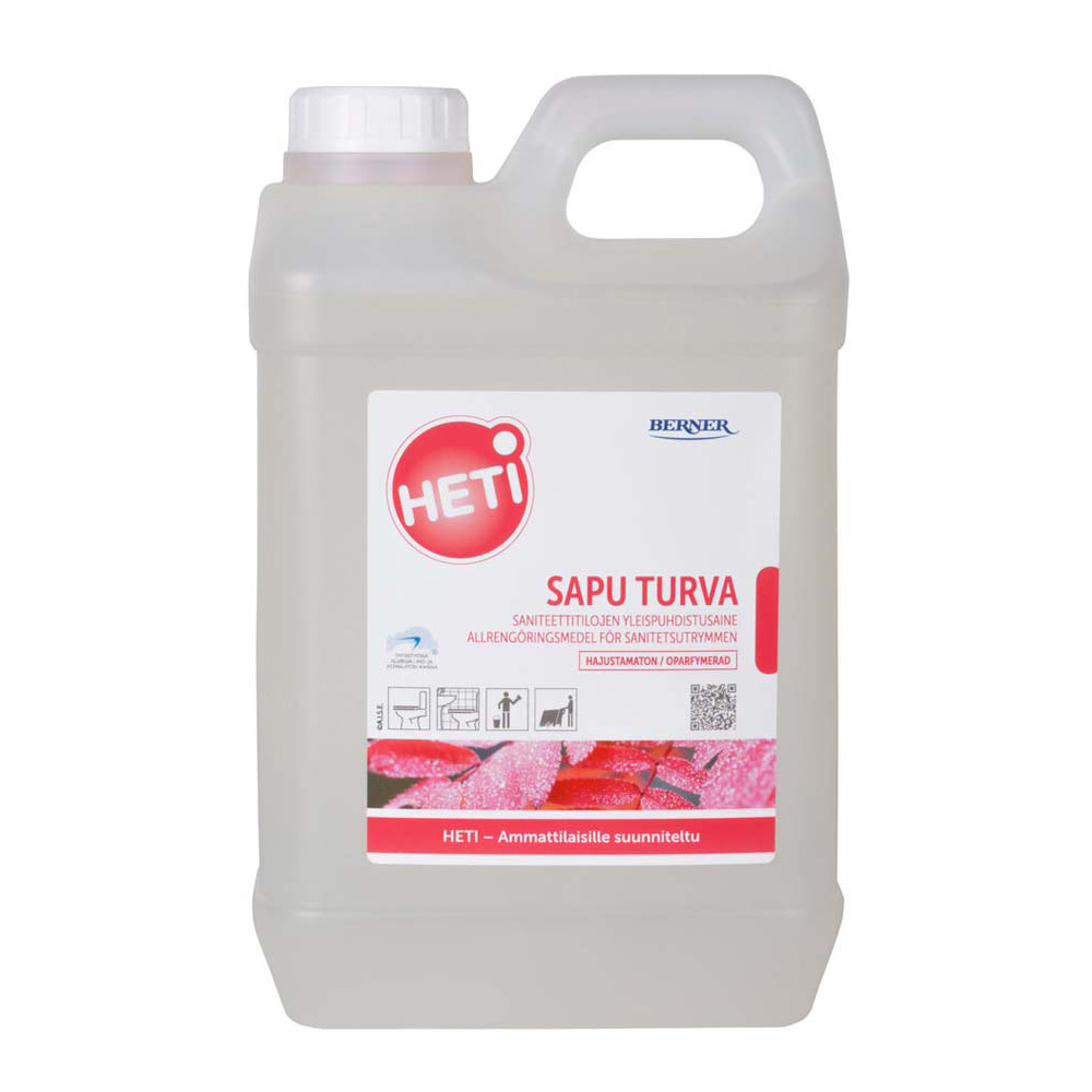HETI Sapu Turva hajustamaton soveltuu saniteetti- ja saunatilojen päivittäiseen puhdistukseen. Tuotetta voidaan käyttää useammille kosteissa tiloissa esiintyville pintamateriaaleille kuten keraamisille laatoille, posliini-, lasi- ja teräspinnoille. HETI Sapu Turvalla on Joutsenmerkki ja Allergia-, iho- ja astmaliiton Allergiatunnusta.Turvapakkaus soveltuu käytettäväksi ainoastaan automaattiannostelijan kanssa.