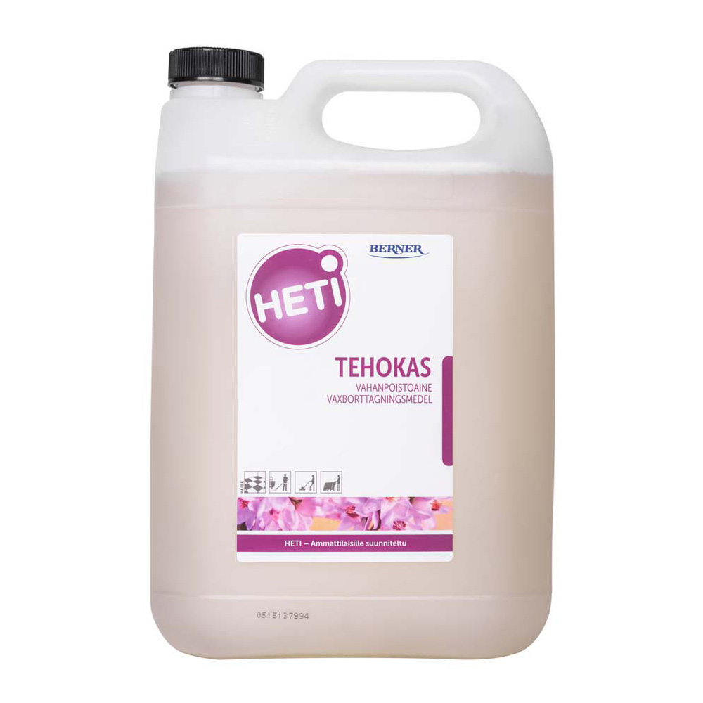 Huuhteluvapaa vahanpoistoaine HETI Tehokas soveltuu kaikille emäksiä kestäville lattiamateriaaleille, ei linoleumipinnoille. Tuotteella voidaan poistaa tehokkaasti pinttyneitä ja kerrostuneita vahapintoja.