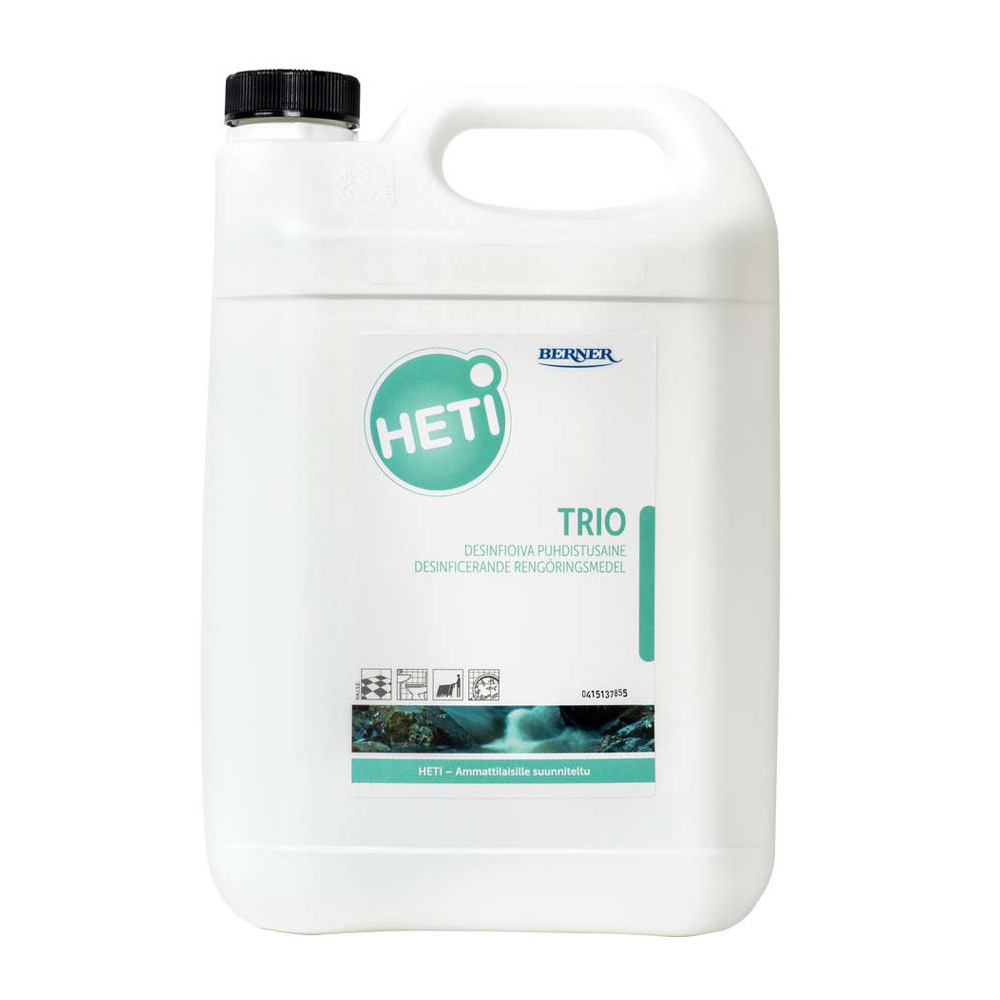 HETI Trio soveltuu pintojen puhdistukseen ja desinfiointiin käsi- sekä konemenetelmin. Kloramin-T on tuotteen tehoaine. HETI Trio pitää myös siivousvälineet puhtaina ja hajuttomina.