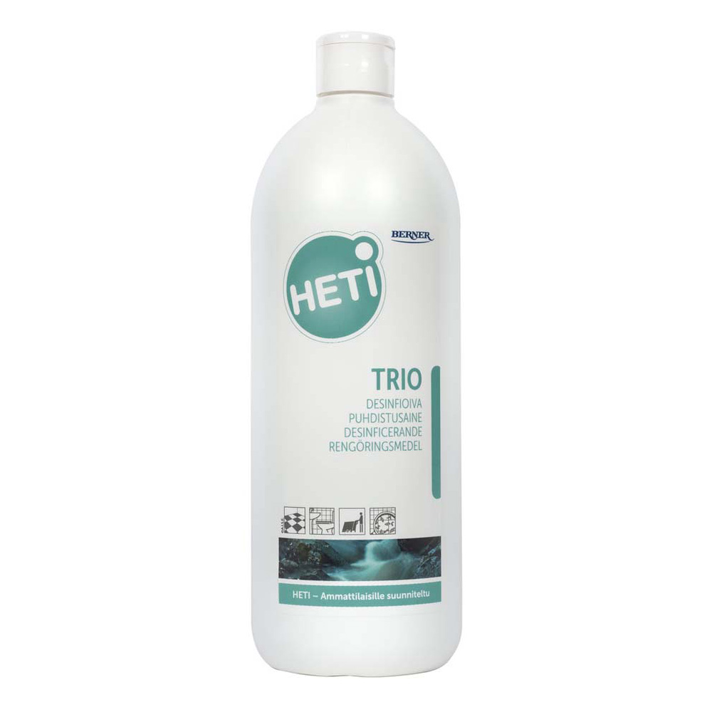 HETI Trio soveltuu pintojen puhdistukseen ja desinfiointiin käsi- sekä konemenetelmin. Kloramin-T on tuotteen tehoaine. HETI Trio pitää myös siivousvälineet puhtaina ja hajuttomina.