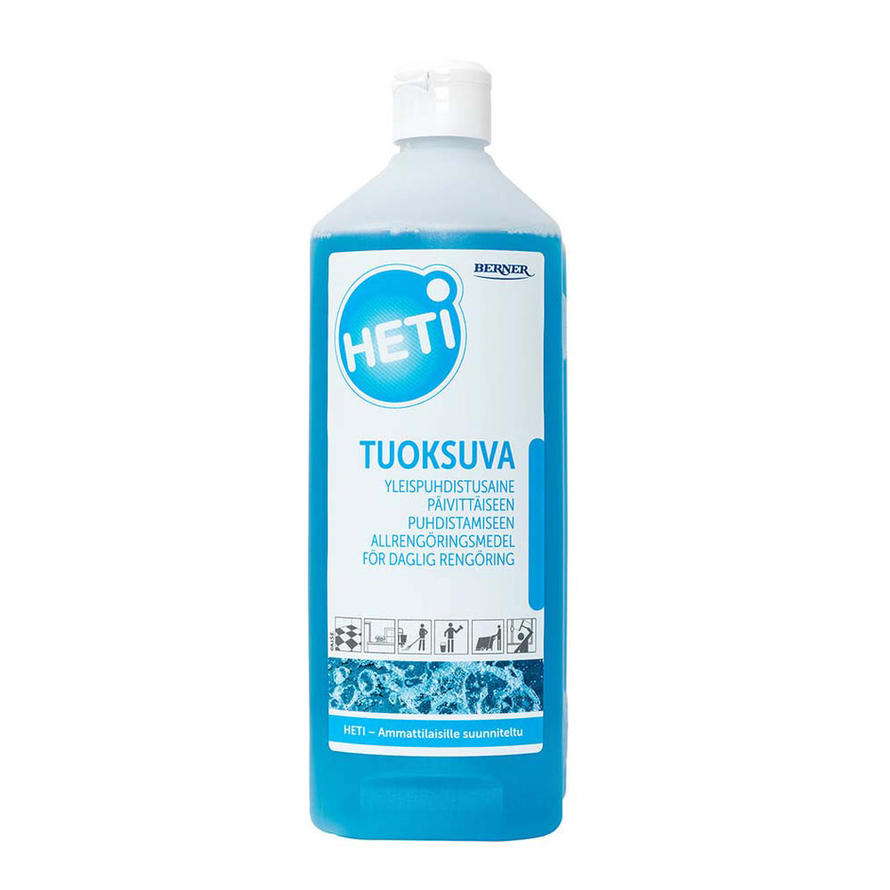 HETI Tuoksuva soveltuu kaikkien vettä sietävien pintojen päivittäiseen puhdistukseen. Tehokkaana puhdistusaineena se soveltuu pinttyneen ja rasvalian poistoon myös yhdistelmäkoneessa. Tuotteessa on raikas tuoksu.