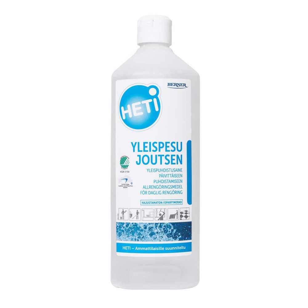 HETI Yleispesu Joutsen hajustamaton on tarkoitettu käytettäväksi kaikkien vettä sietävien pintojen ylläpito- ja peruspuhdistukseen, myös ikkunoiden pesuun. Tuote sopii lisäksi vahattujen lattioiden pintapesuun ennen vahausta käsi- ja konemenetelmiin.