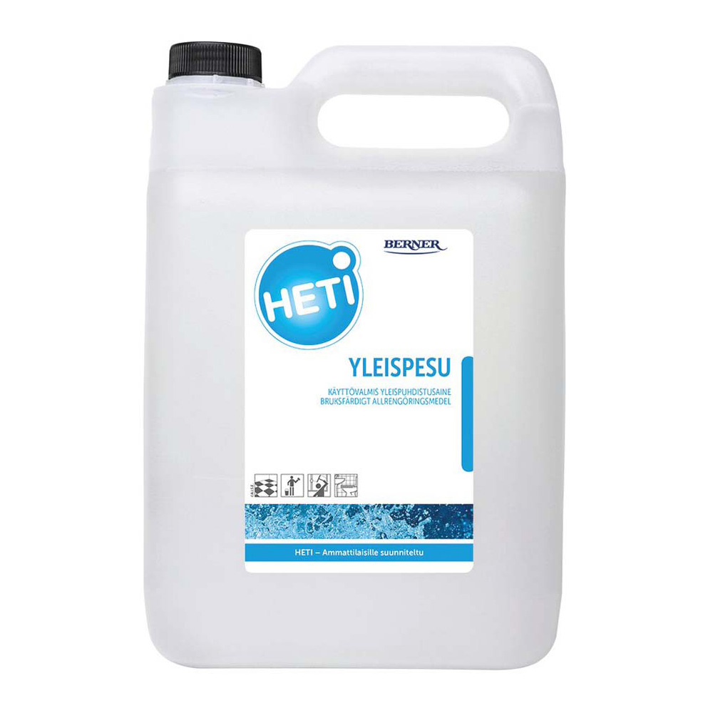 HETI Yleispesu käyttöliuos soveltuu kaikkien kovien pintojen yleispuhdistukseen ja tahranpoistoon, myös peili- ja lasipinnoille. Valmis käyttöliuos suihkepullossa helpottaa ja nopeuttaa puhdistusta.
