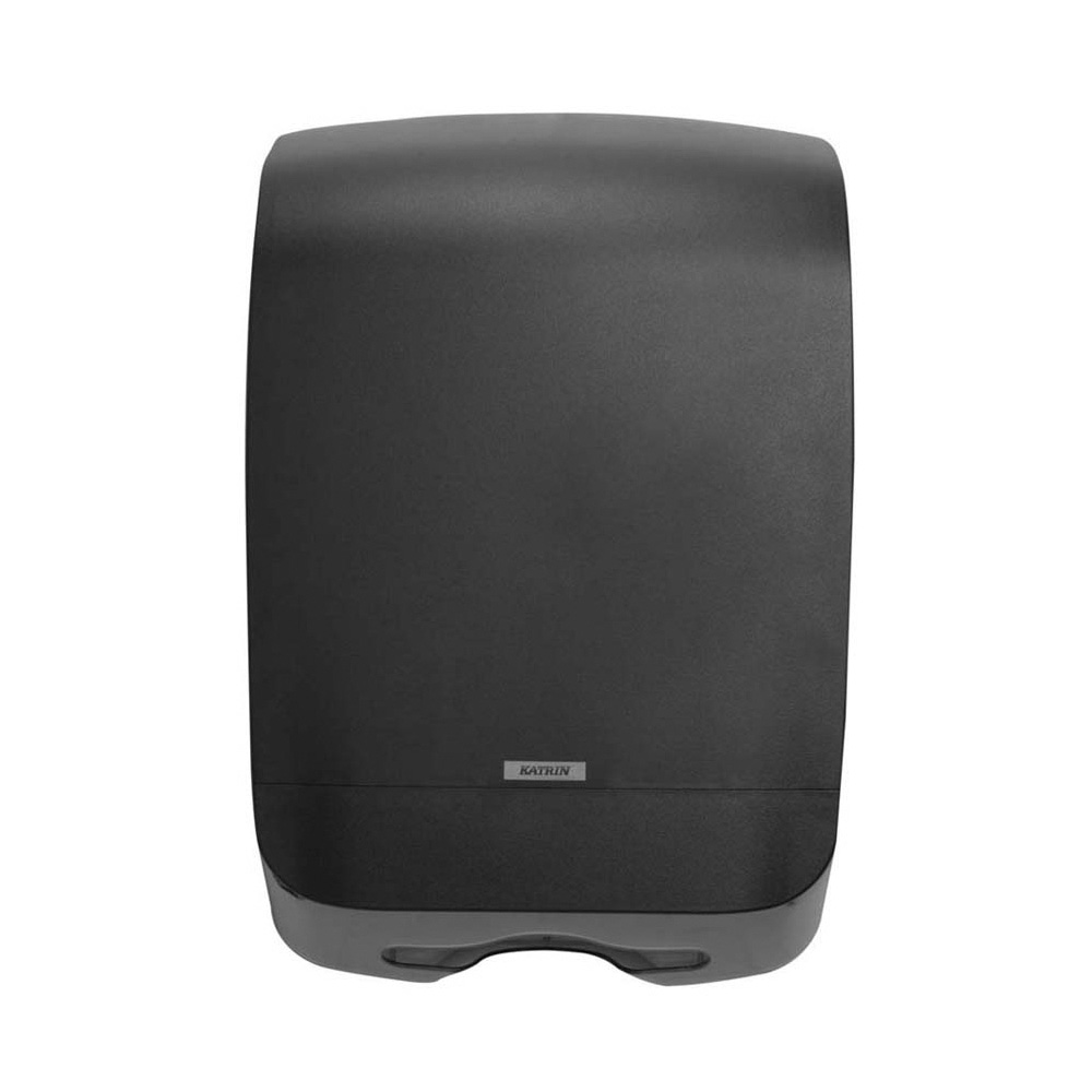 Annostelijaan soveltuvat kaikki taitetut Katrin – käsipyyhkeet. Annostelijan kansi aukeaa ylöspäin, helppo täyttää – pyyhenippu pysyy paikallaan täytettäessä. Annostelijaan mahtuu noin 400 arkkia kerralla. Täytön tarve helppo tarkastaa läpinäkyvistä sivupaneeleista. Mustat Katrin- annostelijat on valmistettu 100% kierrätysmuovista. 35 ME/lava, x mm