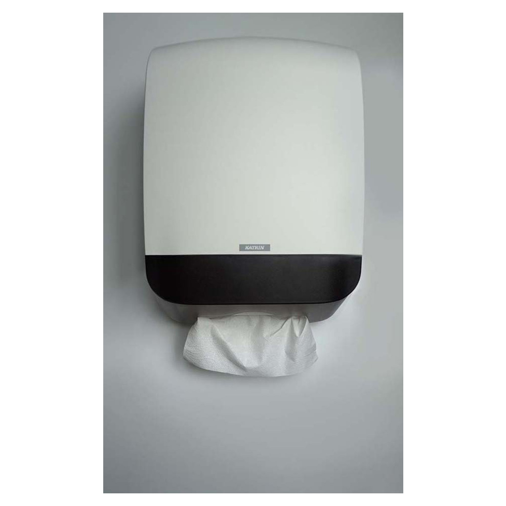 Annostelijaan soveltuvat kaikki taitetut Katrin – käsipyyhkeet. Annostelijan kansi aukeaa ylöspäin, helppo täyttää – pyyhenippu pysyy paikallaan täytettäessä. Annostelijaan mahtuu noin 400 arkkia kerralla. Täytön tarve helppo tarkastaa läpinäkyvistä sivupaneeleista. 35 ME/lava, x mm