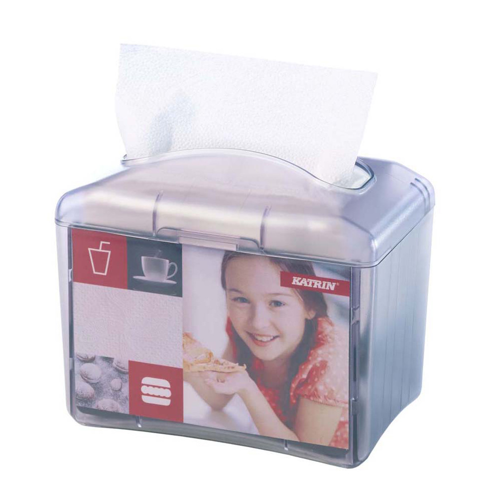 Siirrettävä, helposti sijoitettava lautasliina-annostelija. ABS-muovi (läpinäkyvä/harmaa). Puhtaat lautasliinat annostellaan yksi kerrallaan, kosketusvapaasti. Sopii kaikkiin tiloihin, joissa tarjoillaan ruokaa. Helppo täyttää ja käyttää. Soveltuu Katrin Resta- annostelijaliinoille. 396 ME/lava, x mm