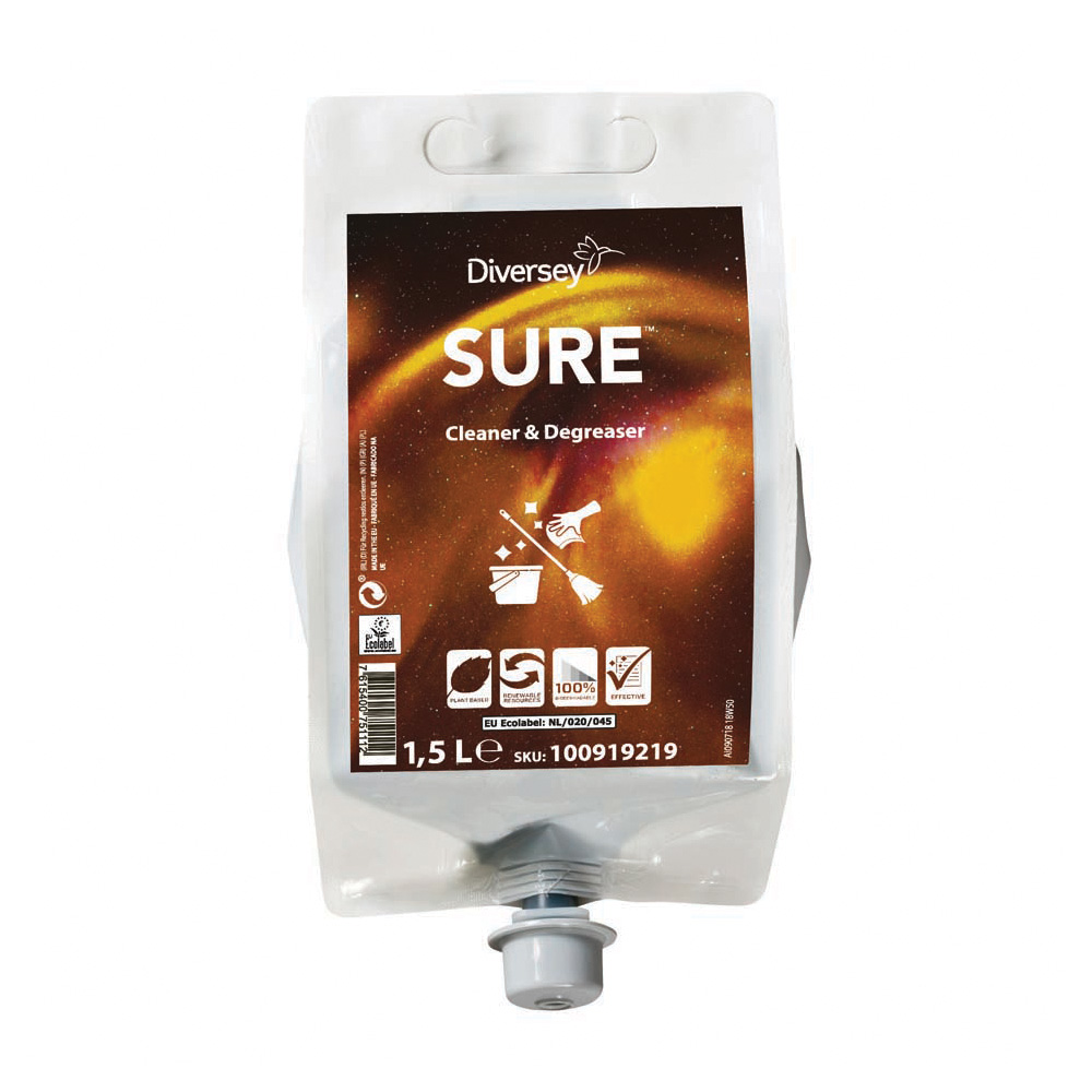 SURE Puhdistus- ja rasvanpoistoaine on osa ainutlaatuista kasvipohjaista, 100% biohajoavaa ammattikäyttöön tarkoitettua tuotesarjaa. Tiivistetty, emäksinen rasvanpoistoaine kaikkien erittäin rasvaisten keittiölaitteiden ja pintojen puhdistukseen. Soveltuu erinomaisesti myös lattioiden tehopuhdistukseen ja vahatun lattian pintapesuun sekä kevyiden vahakerrosten poistoon. Kätevä ja tarkka annostelu Diversey Caren Divermite S -annostelijan avulla Ympäristömerkitty (EU-Kukka).